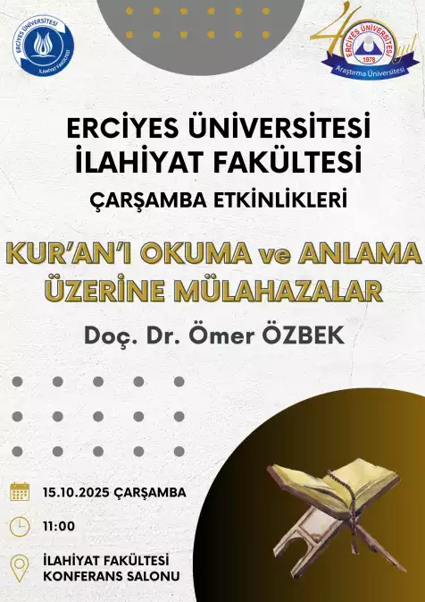 Fakültemizde düzenlenen Çarşamba Etkinliklerinin ikincisi 15.10.2025 Çarşamba günü saat 11:00'da İlahiyat Fakültesi Konferans Salonu'nda, Doç. Dr. Ömer ÖZBEK'in '''Kur'an'ı Okuma ve Anlama Üzerine Mülahazalar'' konulu sunumuyla gerçekleştirilecektir.