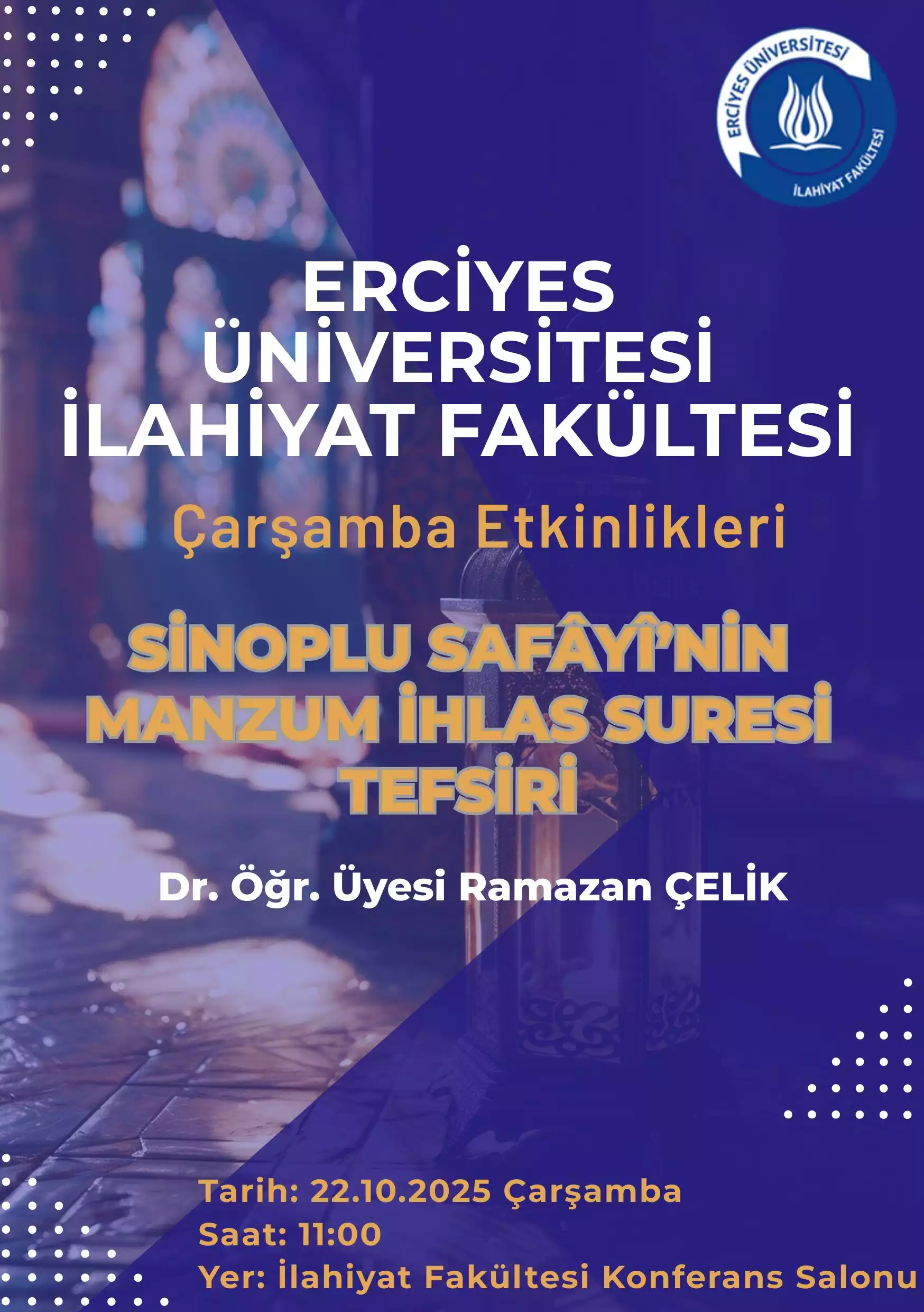 Fakültemizde düzenlenen Çarşamba Etkinliklerinin üçüncüsü 22.10.2025 Çarşamba günü saat 11:00'da İlahiyat Fakültesi Konferans Salonu'nda, Dr. Öğr. Üyesi Ramazan ÇELİK'in "Sinoplu Safâyî'nin Manzum İhlas Suresi Tefsiri"' konulu sunumuyla gerçekleştirilecektir.