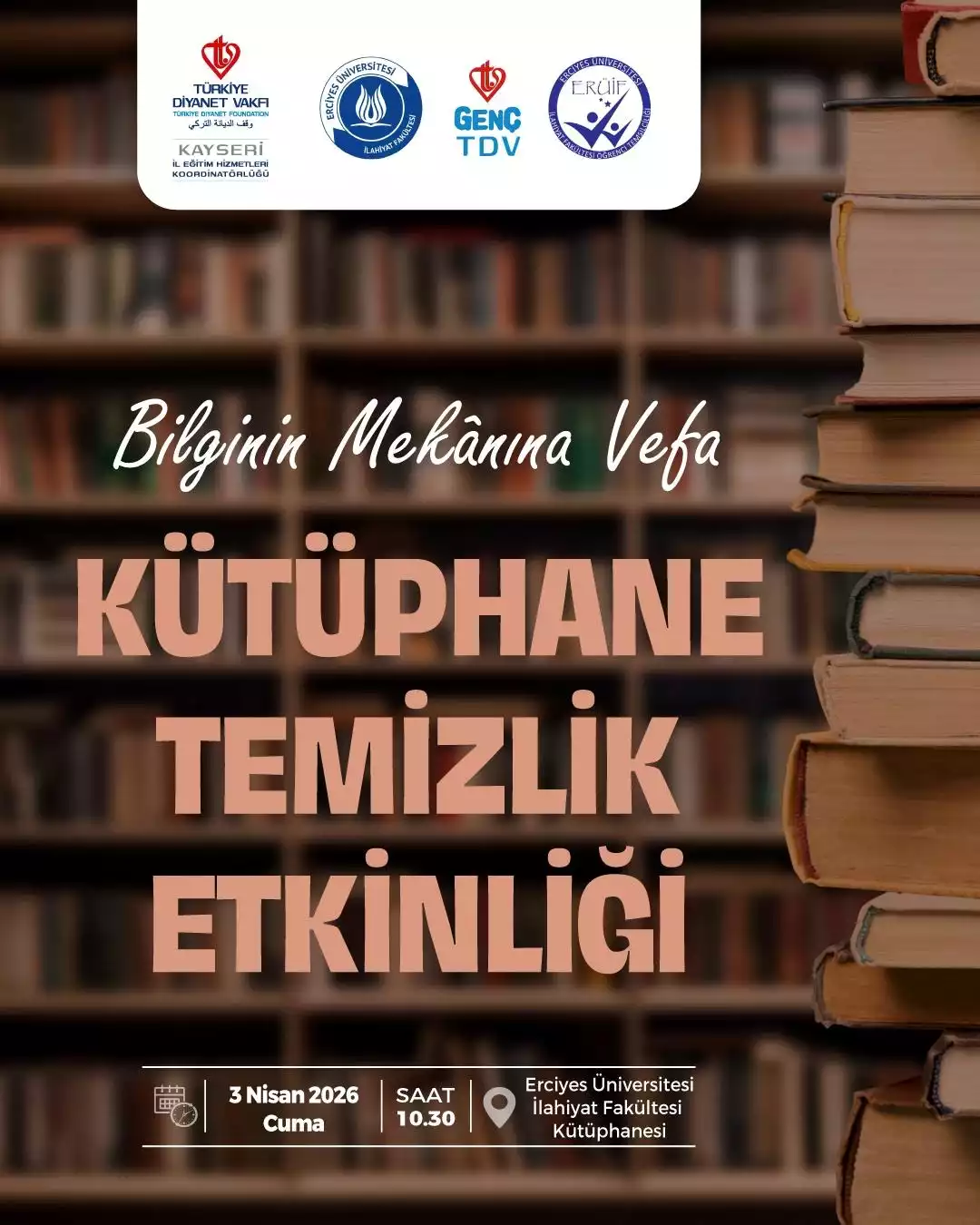 Fakültemiz Öğrenci Temsilciliği, TDV Kayseri İl Eğitim Hizmetleri Koordinatörlüğü ve TDV Genç Kayseri iş birliğinde gönüllü arkadaşlar ile 3 Nisan 2026 Cuma günü saat 10.30'da Fakültemiz kütüphanesinde temizlik etkinliği düzenlenecektir.