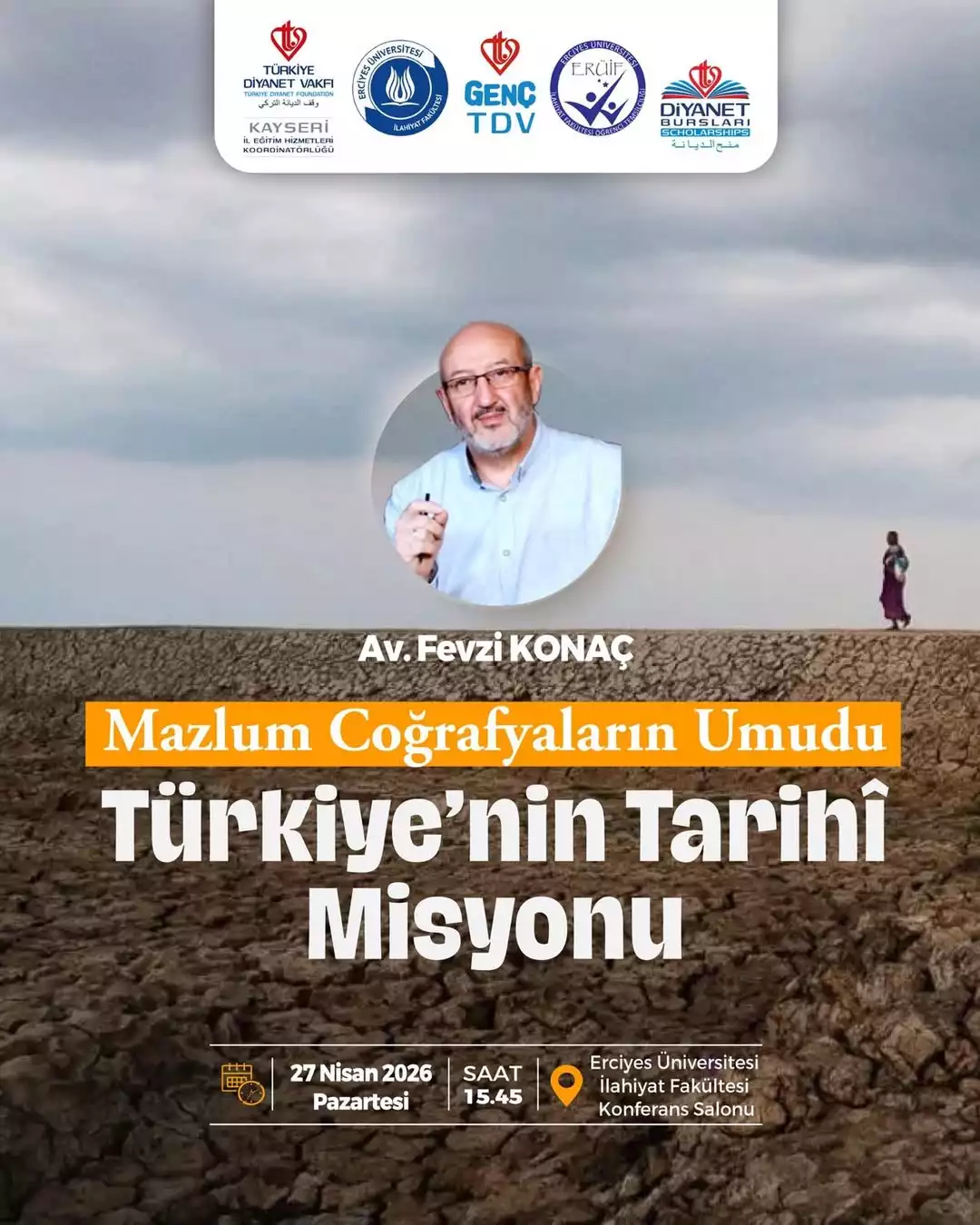 Fakültemiz, TDV Kayseri İl Eğitim Hizmetleri Koordinatörlüğü, Fakültemiz Öğrenci Temsilciliği ve TDV Genç Kayseri iş birliği ile Av. Fevzi KONAÇ'ın konuşmacı olarak katılacağı “Mazlum Coğrafyaların Umudu: Türkiyenin Tarihi Misyonu” konulu etkinlik 27 Nisan 2026 Pazartesi günü saat 15.45’te İlahiyat Fakültesi Konferans Salonunda düzenlenecektir.