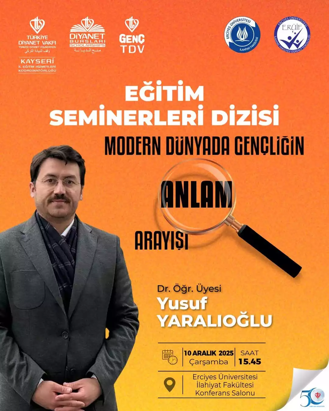 Türkiye Diyanet Vakfı Kayseri İl Eğitim Hizmetleri Koordinatörlüğü ile müşterek düzenlenen Eğitim Seminerleri Dizisi kapsamında 10 Aralık Çarşamba Günü saat: 15.45'te Fakültemiz Konferans Salonu'nda Dr. Öğr. Üyesi Yusuf YARALIOĞLU tarafından "Modern Dünyada Gençliğin Anlam Arayışı" konulu etkinlik düzenlenecektir.