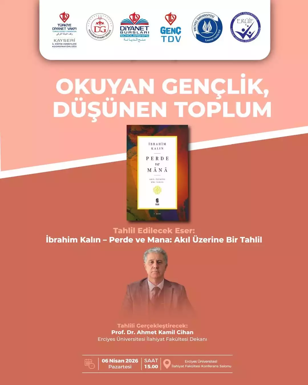 Fakültemiz, TDV Kayseri İl Eğitim Hizmetleri Koordinatörlüğü, TDV Genç Kayseri ve Kocasinan Diyanet Genlik iş birliği ile Erciyes Üniversitesi İlahiyat Fakültesi Dekanı Prof. Dr. Ahmet Kamil CİHAN’ın konuşmacı olarak katılacağı “Okuyan Gençlik Düşünen Toplum” konulu kitap tahlil etkinliği 6 Nisan 2026 Pazartesi günü saat 15.00’de İlahiyat Fakültesi Konferans Salonunda düzenlenecektir.
