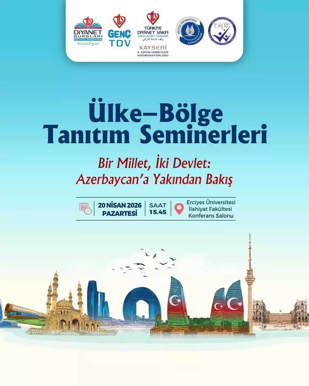 Fakültemiz, TDV Kayseri İl Eğitim Hizmetleri Koordinatörlüğü ve TDV Genç Kayseri iş birliği ile Ülke-Bölge Tanıtım Seminerlerinden “Bir Millet, İki Devlet: Azerbaycan'a Yakından Bakış” konulu etkinlik 20 Nisan 2026 Pazartesi günü saat 15.45’te İlahiyat Fakültesi Konferans Salonunda düzenlenecektir.