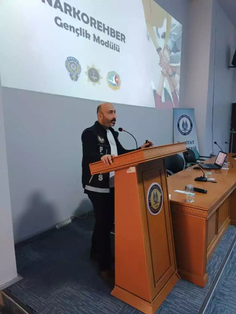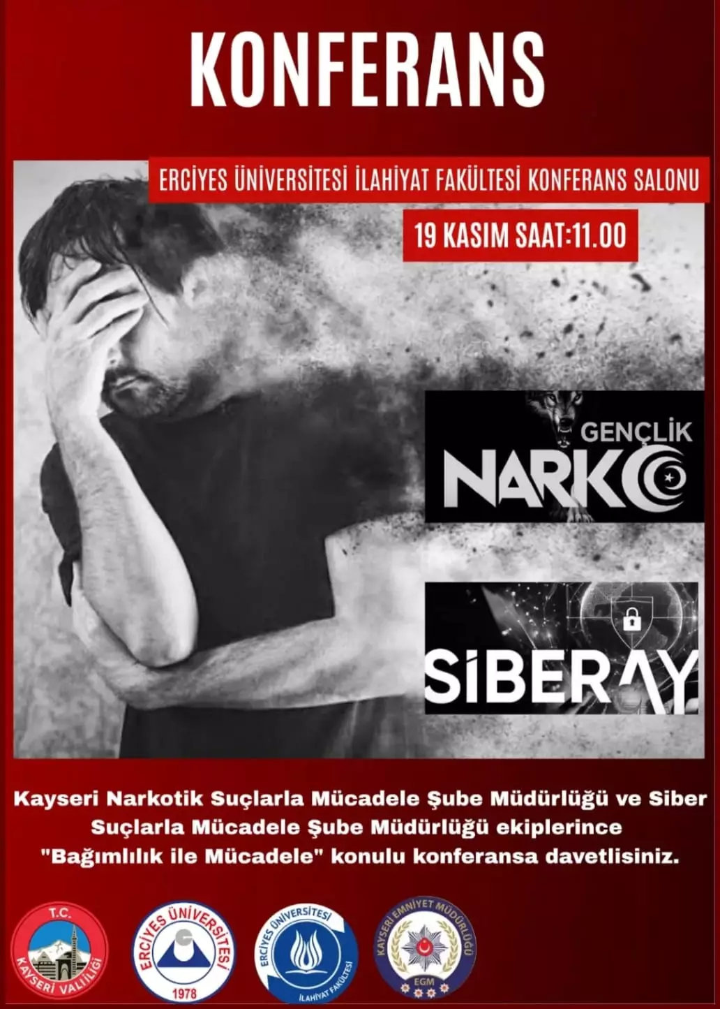 19.11.2025 Çarşamba günü saat: 11:00'de İlahiyat Fakültesi Konferans Salonu'nda Kayseri Narkotik Suçlarla Mücadele Müdürlüğü ve Siber Suçlarla Mücadele Müdürlüğü personelleri tarafından "Bağımlılık İle Mücadele Konferansı" verilmiştir.