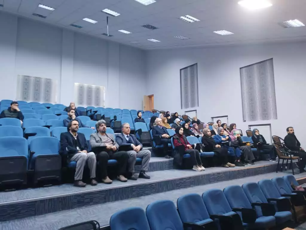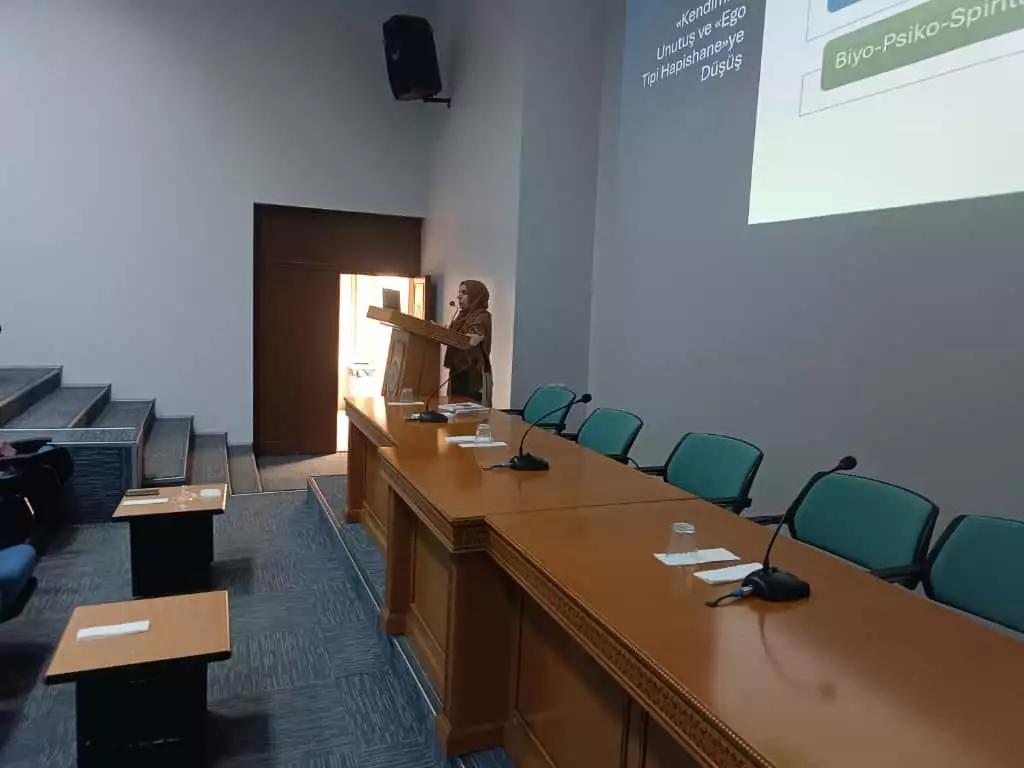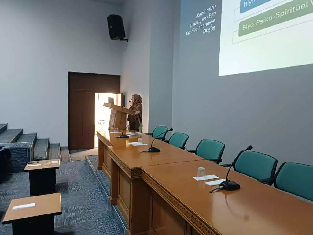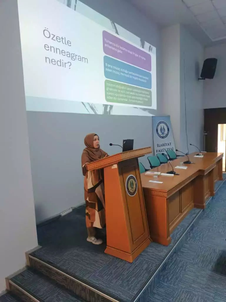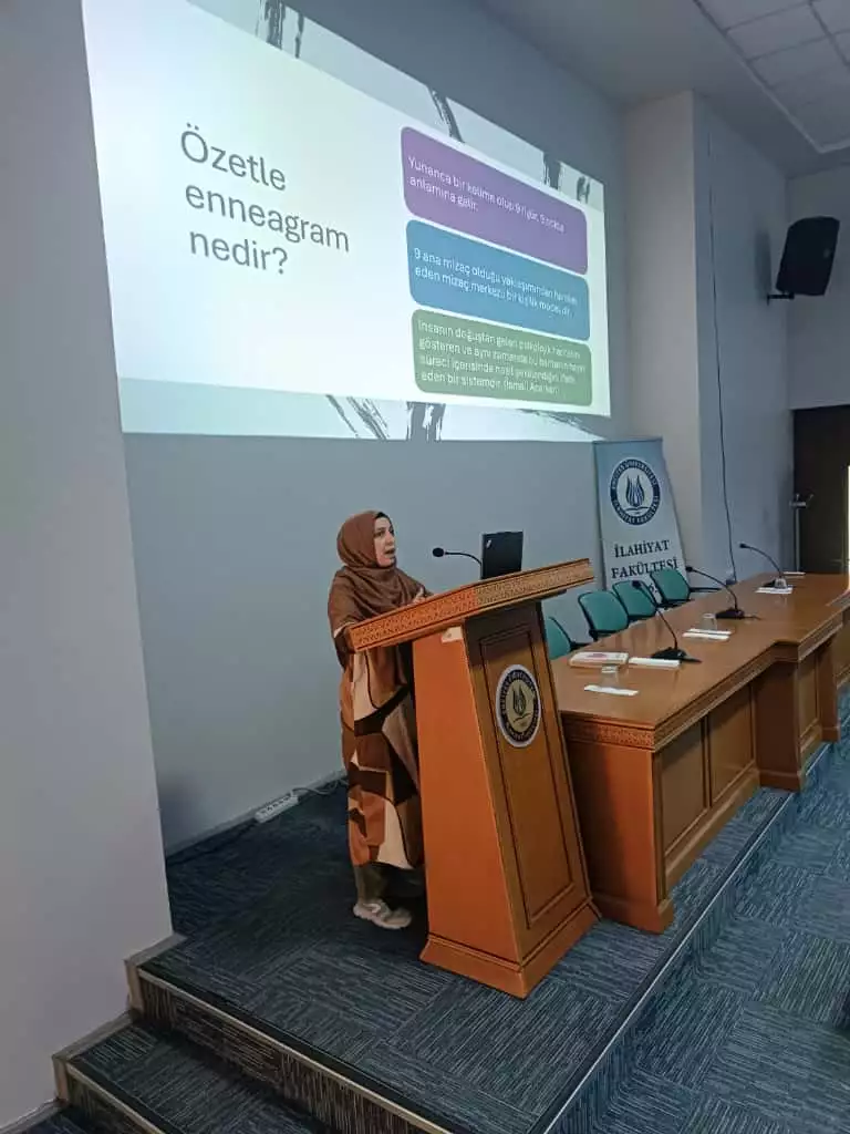 Fakültemizde düzenlenen Çarşamba Etkinliklerinin dördüncüsü 05.11.2025 Çarşamba günü saat 11:00'da İlahiyat Fakültesi Konferans Salonu'nda, Dr. Öğr. Üyesi Kübra ZÜMRÜT ORHAN'ın "Nefsin Esaretinden Ruhun Özgürlüğüne: Enneagramın Kendini Bilmedeki Rolü" konulu sunumuyla gerçekleştirilmiştir.