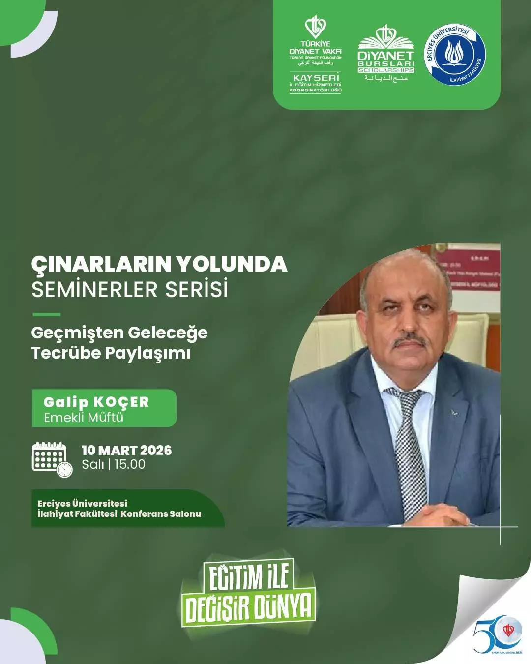 Erciyes Üniversitesi İlahiyat Fakültesi ve Kayseri İl Eğitim Hizmetleri Koordinatörlüğü iş birliğiyle düzenlenen “Çınarların Yolunda Eğitim Semineri” kapsamında, Mart ayı programında emekli müftümüz Sayın Galip Koçer hocamızı misafir ettik.
