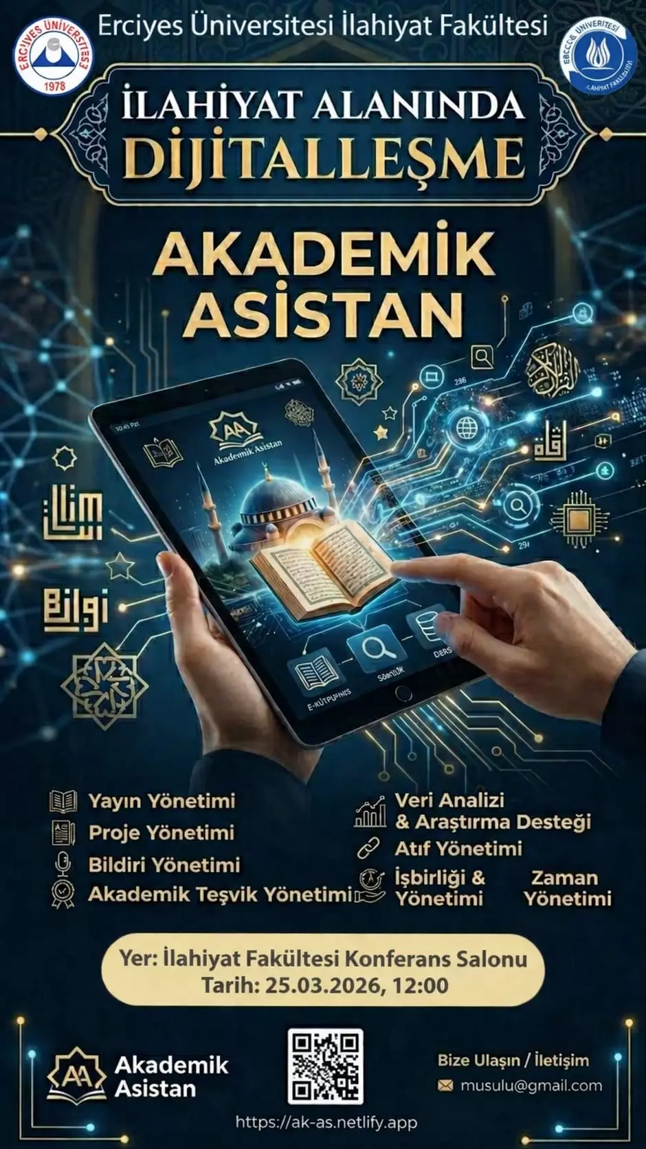25 Mart Çarşamba saat 12.00’de Fakültemiz konferans salonunda, Prof. Dr. Mustafa ULU’nun sunumuyla “İlahiyat Alanında Dijitalleşme: Akademik Asistan” başlıklı eğitim semineri gerçekleştirildi.
