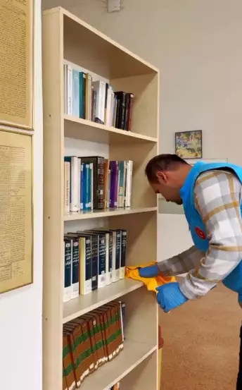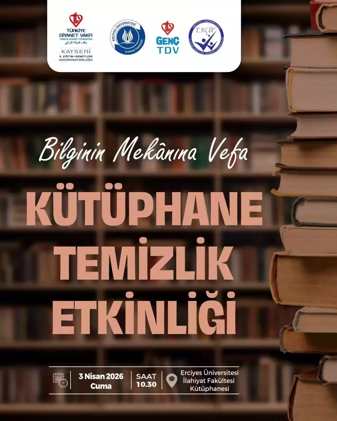 62. Kütüphane Haftası kapsamında Fakültemiz Öğrenci Temsilciliği, TDV Kayseri İl Eğitim Hizmetleri Koordinatörlüğü ve TDV Genç Kayseri iş birliğinde gönüllü arkadaşlar ile 3 Nisan 2026 Cuma günü saat 10.30'da Fakültemiz kütüphanesinde temizlik etkinliği düzenlendi.